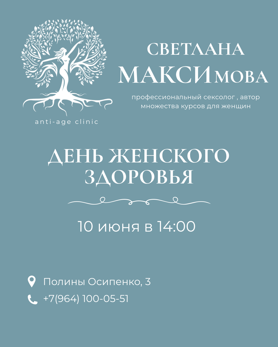 10 июня в 14:00 мы организуем очередной "День женского здоровья" совместно с профессиональным сексологом , автором множества курсов для женщин, Максимовой Светланой.